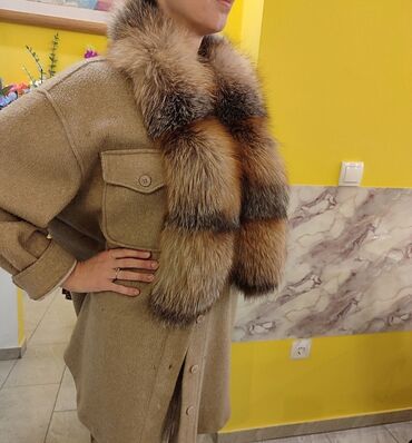 - Materijal: mekana tkanina u boji bež/konjak; bogat, voluminozan krzneni okovratnik u prirodnim braon‑rđastim tonovima