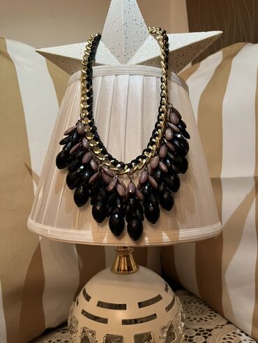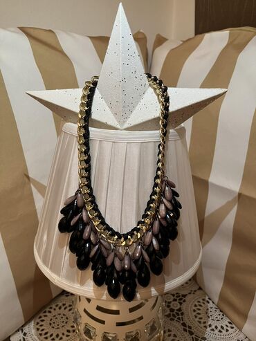 - Materijali: metalni lanac zlatne boje, tekstilna pletenica, akrilne/fasetirane perle