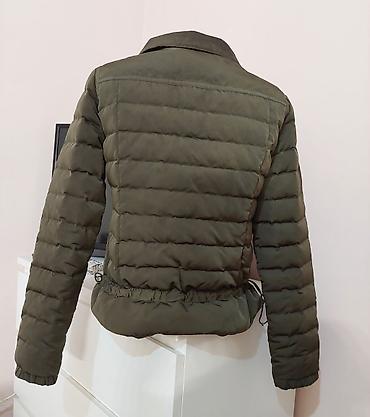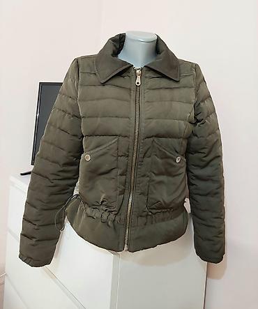 Zimska ženska jakna, maslinasto zelena, punjena i prošivena za toplinu. Kratki, strukirani kroj sa elastičnim pojasom i podesivom učkurom sa obe strane. Klasična kragna u istom tonu. Zatvaranje čvrstim metalnim rajsferšlusom celom dužinom. Dva velika kosa prednja džepa sa dugmadima. Rukavi sa diskretnim nabranim krajevima radi zadržavanja toplote. Unutrašnjost postavljena mekim materijalom za dodatnu udobnost, sa prišivenim etiketama. Diskretne horizontalne prošivene linije spolja, ravna leđa. Praktična i topla za svakodnevnu zimsku upotrebu, u neutralnoj boji koja se lako kombinuje. Idealna za casual stil i gradske uslove.