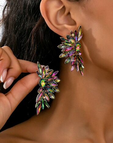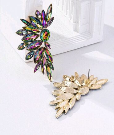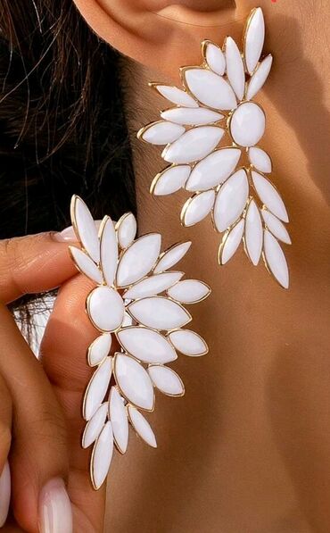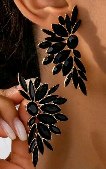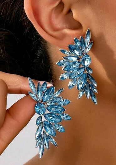 - Dizajn: dramatične, asimetrične minđuše sa motivom lepezasto poređanih listića/latica u marquise obliku; centralni ovalni kamen i niz sitnijih elemenata koji prate uho i nežno se spuštaju niz resicu.