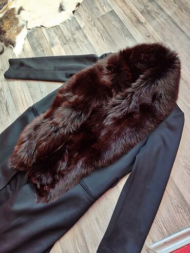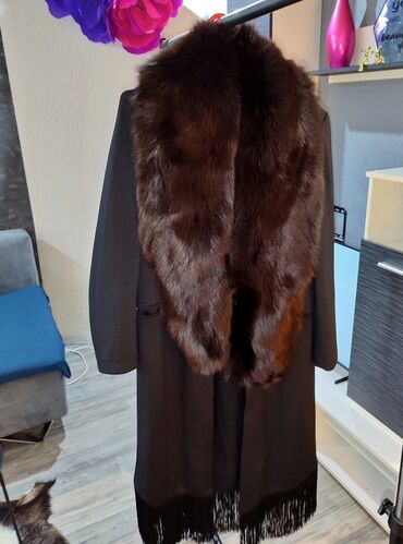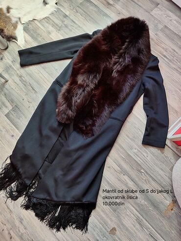 ReseCrni ženski mantil sa raskošnim okovratnikom od prave lisice u tamno braon nijansi. Model sa ravnim krojem i dugim rukavima, dubokim bočnim džepovima i dekorativnom resom po donjem rubu. Materijal mantila je glatak i čvrst, a bogat krzneni okovratnik pruža efektnu, luksuznu notu i dodatnu toplinu. Dužina do ispod kolena. Prilagodljiv za veličine od S do jačeg L.