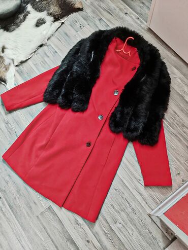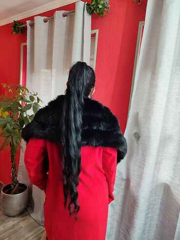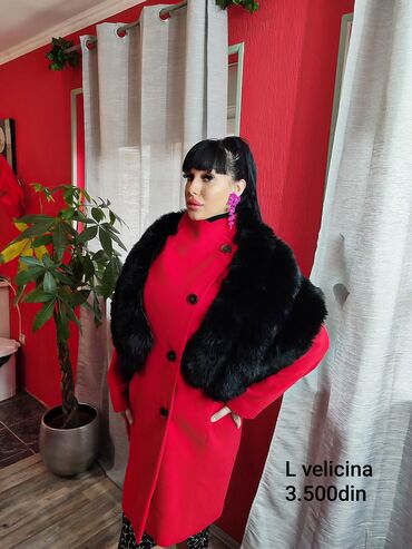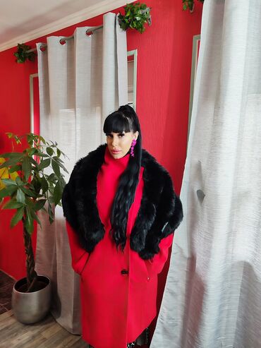 Ženski crveni kaput sa crnim krznenim ovratnikom/šalom.