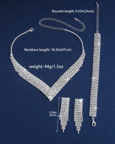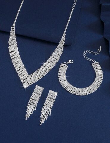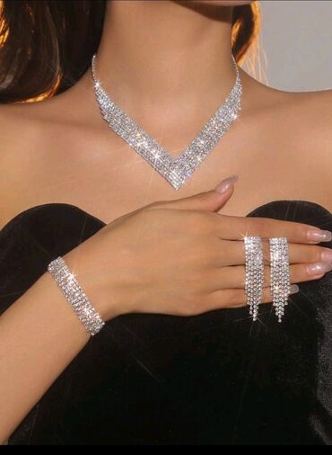 - Dizajn: glamurozan “V” kolier prekriven nizovima sjajnih kamenčića, raskošna narukvica u više redova i duge kaskadne minđuše sa resama od kristala.
