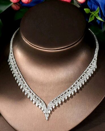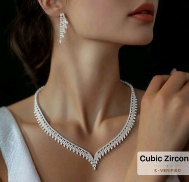 - Dizajn: V–oblikovana ogrlica sa dvorednim nizanjem kamenčića i kapljičastim akcentima; minđuše kaskadnog oblika; prsten sa centralnim grozdom cirkona.