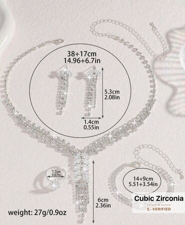 - Minđuše: dugački resa-dizajn sa gornjim lisnatim motivom i dvostrukim nizom cirkona. Dužina 5,3 cm, širina 1,4 cm. Klin/zatvarač za probušene uši.
