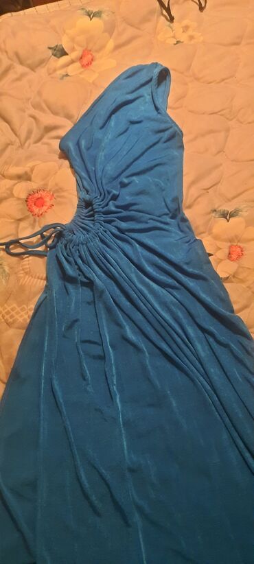 Drugi materijalDuga plava haljina na jedno rame .Boja je uzivo prelepa tirkizno plava ,ne slika se lepo