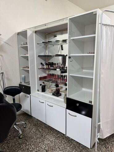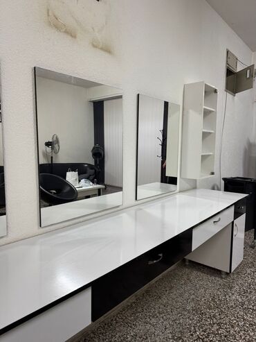 Odličan komplet za opremanje salona: radne stanice, ogledala, zatvoreni ormarići i izložbena vitrina u jedinstvenom stilu.