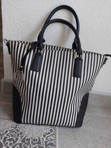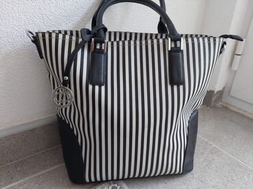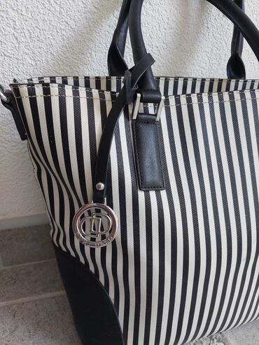 - Dizajn: crno‑bele vertikalne pruge, crni kožni detalji na ručkama i uglovima, metalni privezak sa logom.
