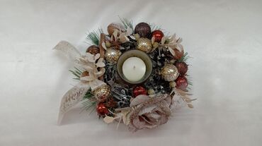 - Bogat venčić od zimzelenih grančica, šišarki i ukrasnih kuglica u zlatnoj, bronzanoj i crvenoj boji sa blistavim efektom.