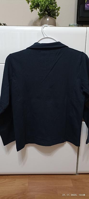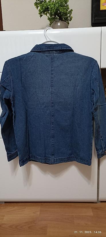 - Materijal: spolja glatka tamnoplava tkanina; poleđina rukava i leđa u teksas/denim izgledu