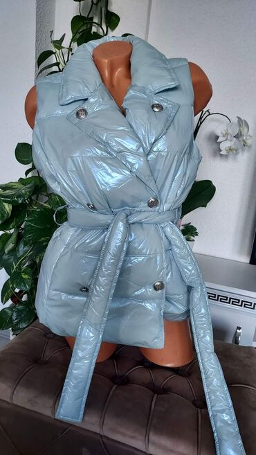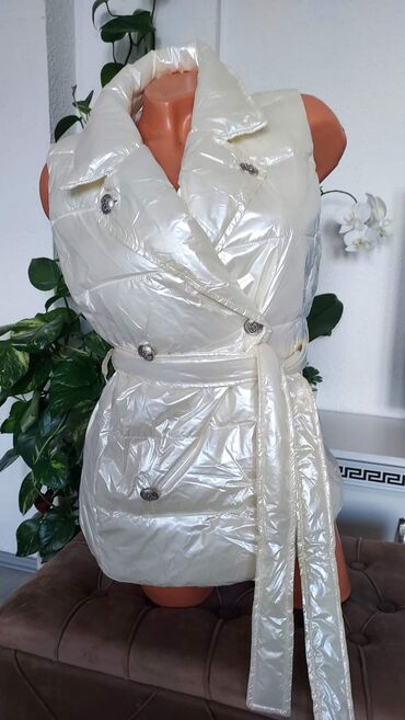 Ženski prsluk od krzna u braon i bež nijansama. Prsluk je bez rukava, sa visokim okovratnikom. Redovi krzna su horizontalno postavljeni i kombinuju tamnije braon delove sa svetlijim bež i krem nija...