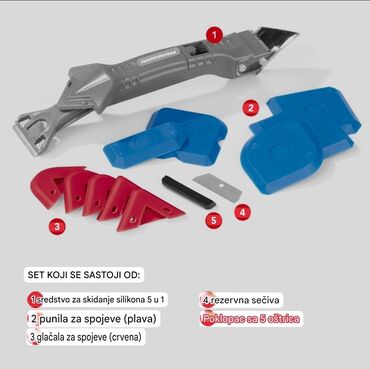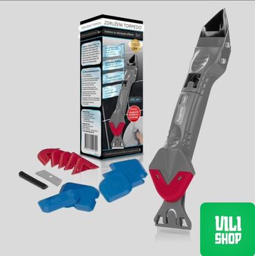 Višenamenski alat za zaptivanje, napravljen od izdržljivog materijala u kombinaciji sive i crvene boje. Dizajniran je za lako uklanjanje silikonskih ostataka i nanošenje svežeg zaptivača. Uz alat dolazi pet razmenljivih glava za zaglađivanje, četiri punila za spojeve, pet oštrica za sečenje i poklopac za oštrice. Integrisani nož omogućava precizno rezanje silikonskih tuba, dok glave za zaglađivanje različitih oblika osiguravaju profesionalan izgled spojeva. Idealan je za sve radove koji uključuju zaptivanje, kako za profesionalce tako i za kućnu upotrebu. Omogućava čiste i precizne rezultate pri svakom korišćenju. Karakteristike: Materijal: Kvalitetna plastika i metal. Boja: Siva i crvena. Namena: Uklanjanje i nanošenje silikona. Sadržaj seta: 5 u 1 alat za skidanje silikona, 4 plava punila za spojeve, 5 crvenih glava za zaglađivanje, 4 rezervna sečiva, poklopac sa 5 oštrica. Funkcionalnost: Integrisani nož za sečenje tuba, različiti uglovi za zaglađivanje. Upotreba: Za kupatila, kuhinje, prozore i druge površine. Preciznost: Omogućava čiste i ravne spojeve. Ergonomija: Udoban za držanje i korišćenje. Komponente: Više delova za različite zadatke. Izdržljivost: Otporan na habanje i dugotrajan. Primena: Profesionalna i kućna. Skladištenje: Kompaktan i lako se odlaže. Održavanje: Jednostavno čišćenje. Model: Združeni Torpedo. Proizvođač: Fugaretto. Tip: Ručni alat.