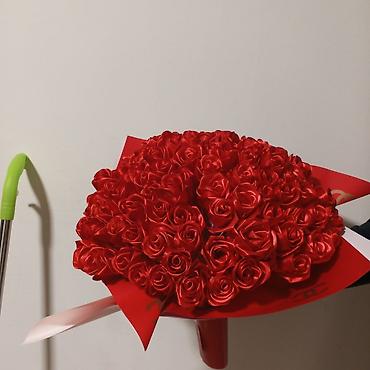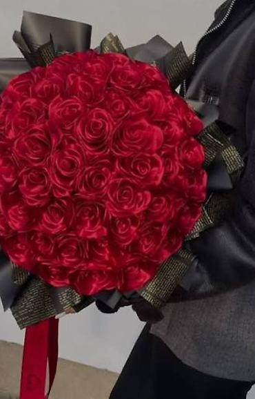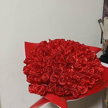 - Raskošan okrugli buket sastavljen od velikog broja ruža napravljenih od sjajne satenske trake.