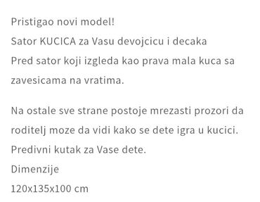 Dečiji šator za igru dostupan u više boja – savršeno mesto za maštovite avanture! 🌈✨ ✅ Jednostavna montaža uz priložene upute 📜 ✅ Stabilna konstrukcija 🏗️ ✅ Prozračan i udoban materijal 🌬️ ✅ Ideal...