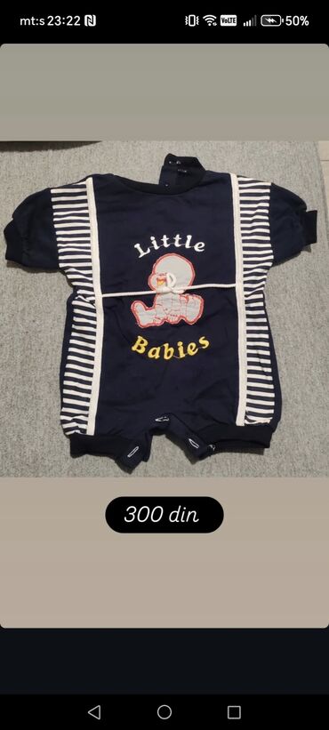 3) Letnji kratki kombinezon tamnoplave boje; bočni paneli sa belim i tamnoplavim prugama; centralni vezeni motiv “Little Babies” sa bebom i natpisom; praktično kopčanje dole. Cena: 300 din.