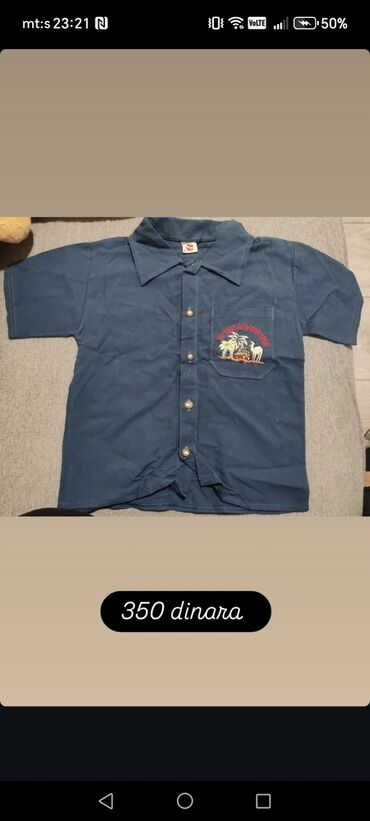 2) Košulja kratkih rukava u teget‑plavoj boji; klasična kragna, kopčanje napred na pritiskače/dugmad; našiveni džep na levoj strani sa šarenim vezom “TO THE ADVENTURE” (palme, džip, životinje). Cena: 350 dinara.