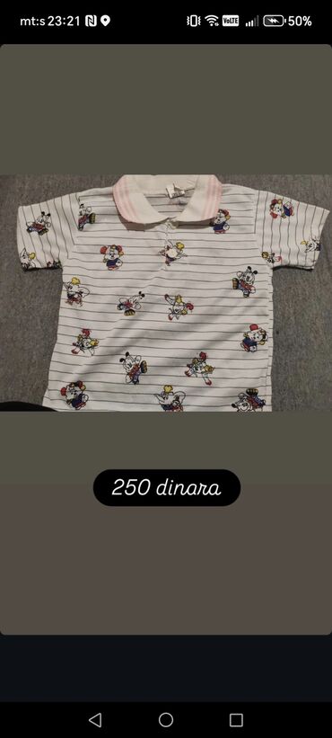 1) Majica sa kragnom i kratkim rukavima, belo‑krem sa tankim prugama i razigranim crtanim motivima po celoj površini; svetloružičasta kragna, delimično kopčanje napred. Cena: 250 dinara.