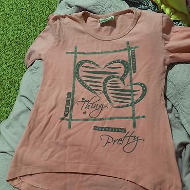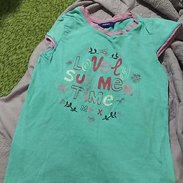 - Majica kratkih rukava, mint zelena, brend MEXX, štampa “Lovely Summer Time” u roze/belim tonovima, kontrastni roze obrubi na okovratniku i rukavima.