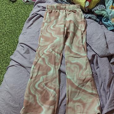 - Helanke/pantalone od rastegljivog džersi materijala u svetlo‑roze nijansi sa apstraktnim talasastim šarama; elastični pojas.