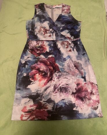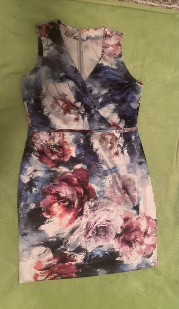 1) Bez rukava, dužina iznad kolena, V‑izrez sa preklopom na grudima i skrivenim rajsferšlusom na leđima. Kroj blago prati liniju tela. Materijal sa satenskim sjajem i apstraktnim cvetnim printom u nijansama plave, ljubičaste, bordo i bele.