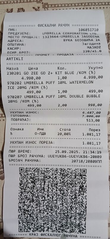 - Fiskalni račun prikazuje stavku: GO ZEE GO Z+ KIT BLUE i dve e‑tečnosti Umbrella Puff 10 ml (Watermelon Ice 20 mg i Double Bubble 20 mg).
