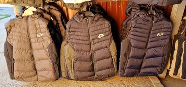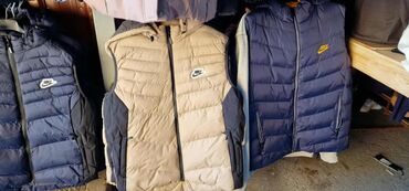 Muške zimske prsluke bez rukava, sa kapuljačom. Pufnasta, prošivena izrada sa horizontalnim štepovima, punjeni za dodatnu toplotu. Spoljašnji materijal otporan na vetar, glatke površine; unutrašnjost mekša za komfor. Prednji centralni rajsferšlus pune dužine, zaštita za bradu na vrhu. Dva bočna džepa sa rajsferšlusom. Kapuljača sa učkurom za podešavanje. Logotip Nike na grudima (različite varijante boja logotipa).