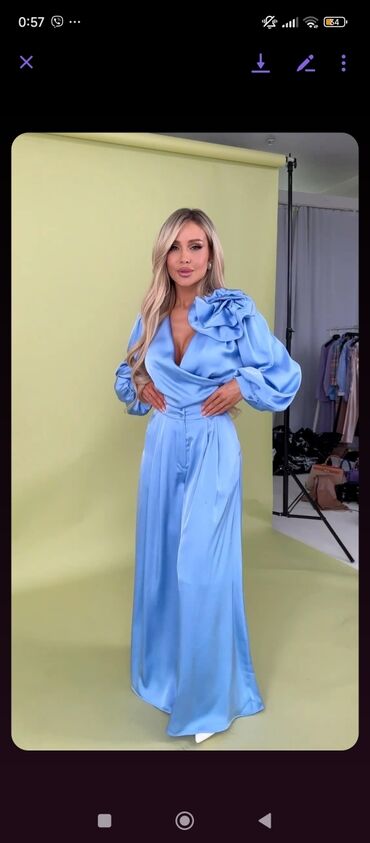 Ženski dvodelni komplet koji se sastoji od bluze sa širokim rukavima i širokih pantalona. Bluza je labavog kroja sa okruglim izrezom i metalik zlatnim ukrasima na kragni i rubovima rukava. Pantalon...