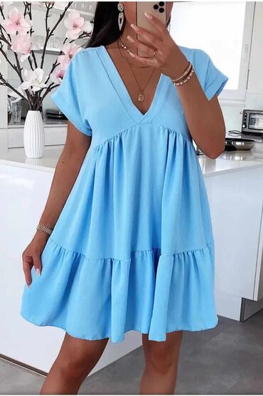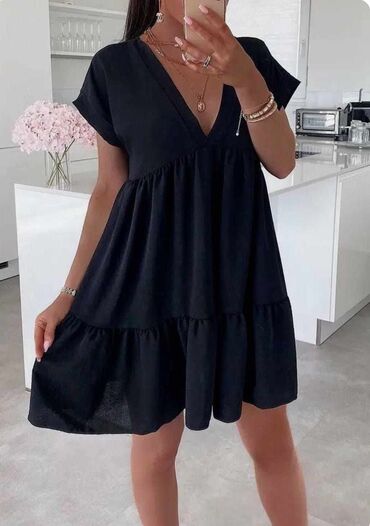 Crna haljina/tunika sa sjajnim nitima, 3/4 rukavi. Okrugli izrez, asimetričan donji deo sa višeslojnim panelima: čipkani sloj, sitno-karo tkanina i glatka crna tkanina sa diskretnim belim kvadratim...