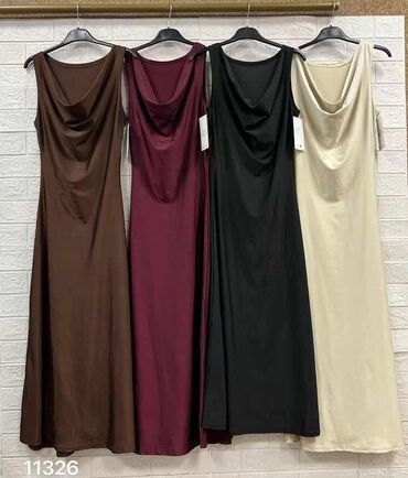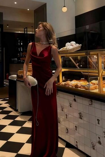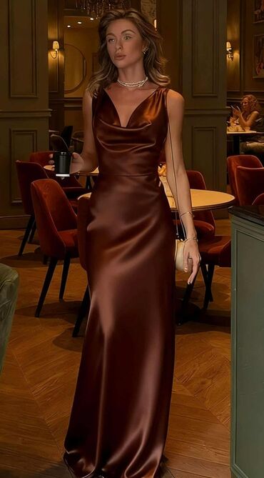 Večernji, maturskiSvečana duga haljina bez rukava sa efektnim „waterfall“/kaskadnim dekolteom. Kroj prati liniju tela i blago se širi ka dnu, stvarajući elegantnu siluetu pogodnu za večernje prilike, proslave i koktel događaje. Tkanina je glatka i sjajna (satenski izgled) koja lepo pada i pruža sofisticiran odsjaj na svetlu.
