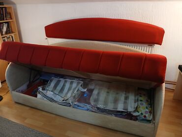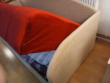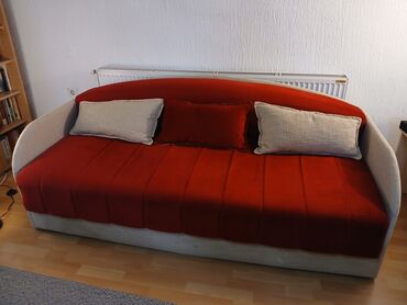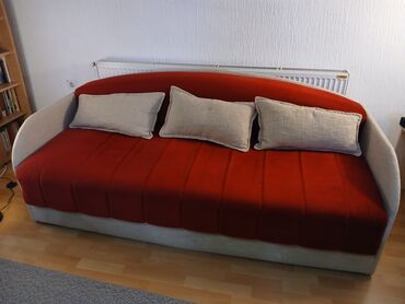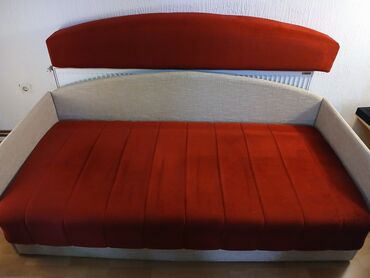 JednobojniKauč u kombinaciji crvene i bež boje, sa zaobljenim naslonom. Ovaj komad nameštaja ima mogućnost sklanjanja dugačkog jastuka-naslona, pretvarajući se u prostrani ležaj, idealan za goste ili svakodnevno spavanje. Uključuje i integrisani prostor za odlaganje ispod sedišta, što ga čini praktičnim rešenjem za male prostore ili dodatno skladištenje posteljine. Dolazi sa tri ukrasna jastuka, sa dva lica bež i crveni, pružajući dodatnu udobnost i estetsku dopunu. Pogodan je za dnevne sobe ili gostinske sobe, kombinujući funkcionalnost i stil. Njegov dizajn sa zaobljenim elementima doprinosi modernom izgledu. Idealno rešenje za optimizaciju prostora u vašem domu. Udoban je za sedenje tokom dana i za spavanje tokom noći. Lak za održavanje. Pogodan za svakodnevnu upotrebu u različitim enterijerima.