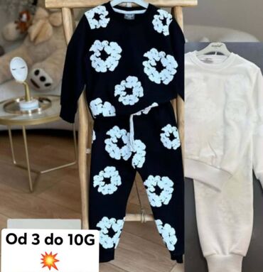 Druga veličina (visina u cm)Dečiji komplet džemper + donji deo (trenerka) sa printom belih cvetnih krugova.
