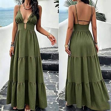 - Model: maxi dužina, više širokih volana, dubok V izrez napred sa dekorativnim prorezom ispod grudi
