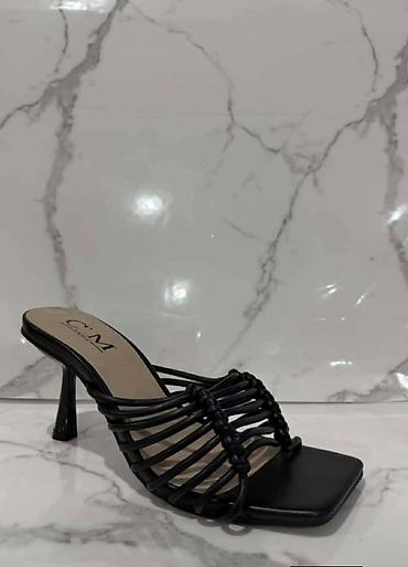 - Model 3: Crne mule sandale sa kvadratnim vrhom. Gornjište od više kožnih/pletenih kaiši povezanih čvorovima, otvoreni prsti. Tanka, raširena potpetica srednje visine za trendi, arhitektonski izgled.