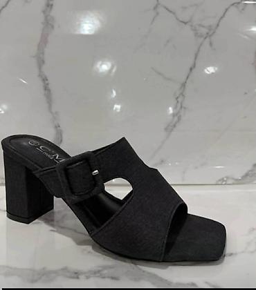 - Model 4: Crne mule sandale sa zatvorenijim gornjištem od materijala nalik denimu, kvadratni vrh i otvoreni prsti. Masivna blok potpetica i ukrasni „džep“ šav sa metalnim nitnama sa strane za efekat farmerki.