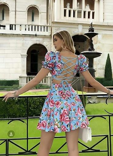 Floral mini haljina sa puf rukavima i vezivanjem na leđima
