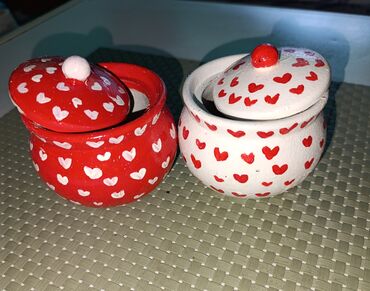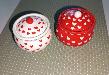 Dve gipsane posude sa poklopcima, ukrašene ručno crtanim srcima. Jedna posuda je bele boje sa crvenim srcima, dok je druga crvene boje sa belim srcima. Idealne su za odlaganje sitnica, nakita ili kao dekorativni elementi u domu.
