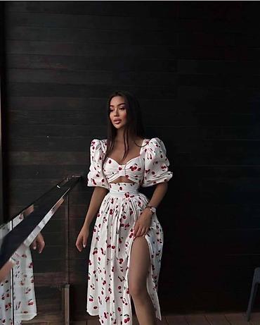 - Dizajn: romantičan letnji komplet sastavljen od kratkog topa i A-kroj midi suknje.