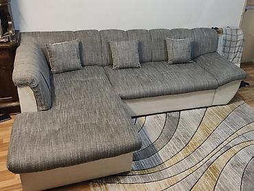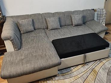 Ugaona garnitura sa ležajem i tabure-otomanskim delom. - Dimenzije: 250 × 160 cm (duža strana x kraća strana) - Sivi štof sa dekorativnim prošivima i geometrijskim šarama - Uključeni jastuci u viš...