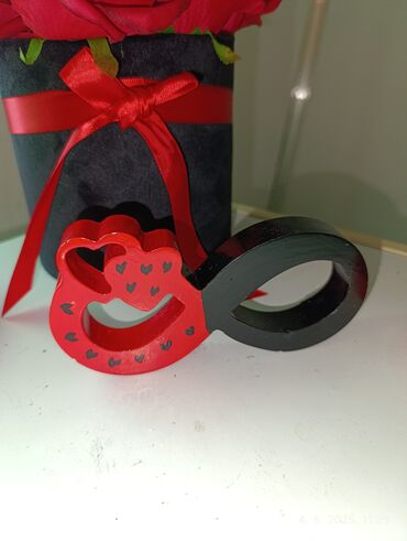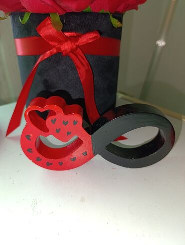 CrvenaUkras od gipsa u obliku znaka beskonačnosti, obojen u crno i crveno. Crveni deo ukrašen je malim srcima i otvorima u obliku srca, dajući mu romantičan izgled. Idealan je kao dekorativni element za police, stolove ili kao deo aranžmana.