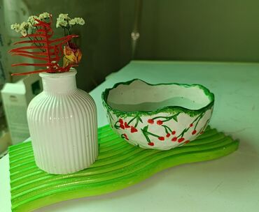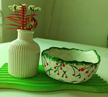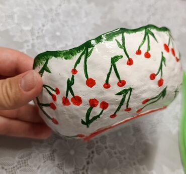 O trošku kupcaRučno rađena gipsana činija sa motivom trešanja. Ivica činije je obojena u zeleno. Idealna je za posluzivanje slatkiša ili kao dekorativni predmet u vašem domu.