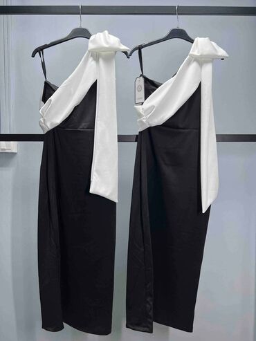 - Dizajn: asimetričan gornji deo sa belim, širokim panelom koji prelazi preko grudi i jednog ramena; na desnoj strani veliki dekorativni beli mašni detalj sa dugim repovima.
