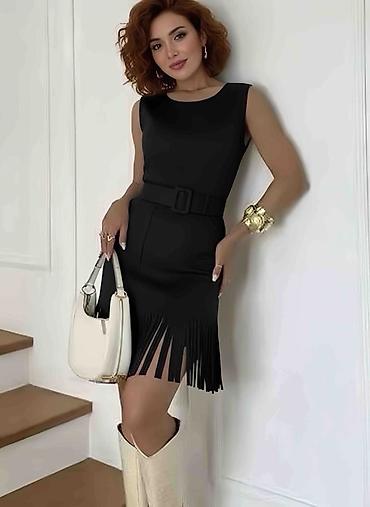 - Detalji: dekorativne rese na donjem rubu, širi pojas u kompletu sa pravougaonom kopčom za naglašavanje struka; skriveni rajsferšlus pozadi; praktični bočni džepovi.