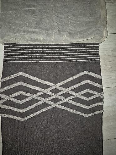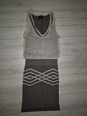 - Donji deo: uska suknja do kolena sa geometrijskim, srebrnkastim romboidnim/linijskim dezenom napred.