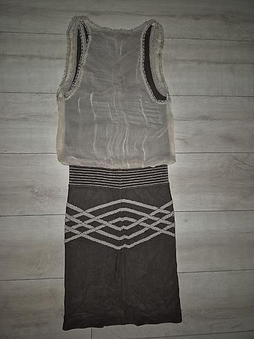 - Dvodijelni izgled: gornji deo kao proziran bezrukavnik preko potkošulje i pripijena suknja.