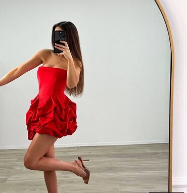 Koktel mini haljina bez bretela sa izraženom korpom i skulpturalnom balon-suknjom.