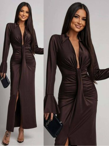 Elegantna midi haljina sa dubokim V izrezom i dugim rukavima. Model prati liniju tela, ima efektno čvor-nabrano vezivanje u predelu struka koje vizuelno sužava siluetu, kao i prednji šlic do iznad kolena za lakše kretanje. Rukavi su blago zvonasti pri završetku, a kragna u stilu košulje daje sofisticiran izgled. Glatka, satenski sjajna tkanina pruža prijatan pad i diskretan odsjaj pod svetlom. Dostupna u više boja: bordo, čokoladno braon i crna. Idealna za večernje prilike, svečanosti i posebne događaje.