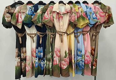 Ženska košulja-haljina sa cvetnim printom - Kroj: mini dužina, struk naglašen integrisanim pojasom sa šnalom; kratki rukavi sa blagim naduvavanjem na ramenima; klasična košulja-kragna. - Kopčanje:...