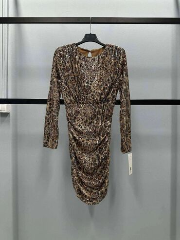 - Dizajn: kombinacija leopard uzorka i metalik šljokica u zlatno-brončanim tonovima; drapiranje i nabori duž struka i bokova vizuelno sužavaju struk i naglašavaju figuru