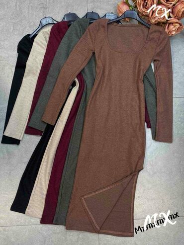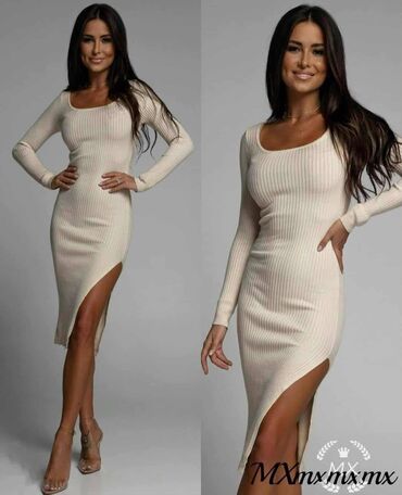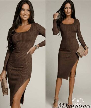 Rebrasta midi haljina sa dugim rukavima i dubokim bočnim prorezom.