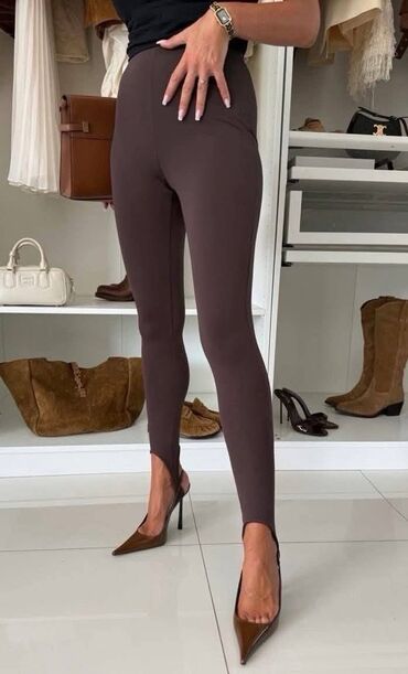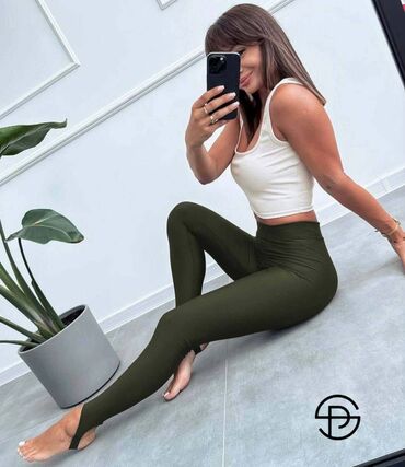 - Kroj: visok struk za blagi oblikujući efekat i produženu liniju nogu; uske nogavice sa otvorom i elastičnim remenom koji se oblači preko pete – helanke stabilno stoje i ne podvlače se.